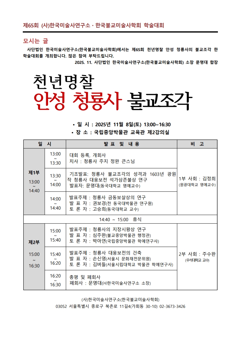 사단법인 한국미술사연구소(한국불교미술사학회)에서는 제65회 천년명찰 안성 청룡사의 불교조각 학술대회를 개최합니다.