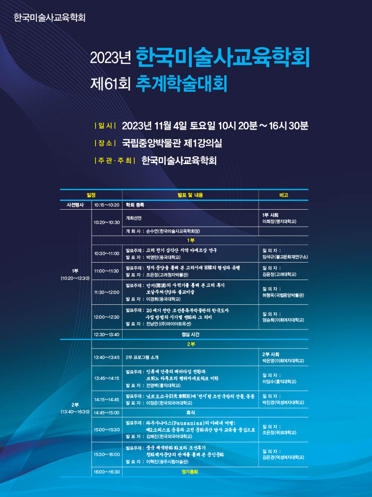 한국미술사교육학회는 11월 4일 토요일 국립중앙박물관 제1강의실에서 아래와 같이 제61회 추계학술대회를 개최합니다.