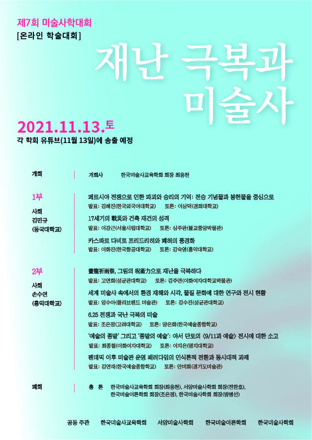 <제 7회 미술사학대회>가 오는 2021년 11월 13일 유튜브를 통해 송출될 예정입니다.